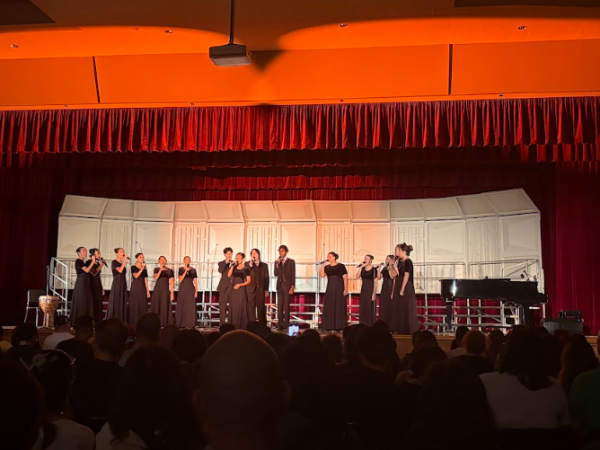 The vocal Jazz ensemble showed off their vibrant voices that matched with different colored lights to convey the mood of the songs with pieces including “Doomsday” by Rob Dietz with soloists Destiny Garcia (12) and Leah Ines (12), before the Men’s Ensemble performed. The Men’s section sang songs like “Haul Away, Joe” by Zac Stelzer with solos from Brandon Perez (12), Jacob Rojano (11), Westley Wang (9), and Joe Jacobs (12), showcasing a deeper tune before moving into intermission.